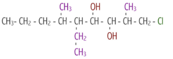 Formulación en Química Orgánica Consideraciones generales Un compuesto orgánico alicíclico, es decir, de cadena abierta, consiste en una cadena de átomos de carbono, los cuales soportan cadenas carbonadas más o menos cortas y grupos funcionales diversos; un compuesto cíclico estará constituido por uno o varios anillos carbonados, a los cuales se enlazarán asimismo cadenas u otros grupos funcionales. La variedad de posibilidades es enorme, como sabemos. Incluso atendiendo a las reglas que se verán a continuación, en numerosas ocasiones hay más de una posibilidad para nombrar un compuesto. Todas serán válidas siempre que describan inequívocamente la estructura del compuesto de que se trate. Todos los derechos reservados. © LamanzanadeNewton.com. En primer lugar, la IUPAC ha establecido un sistema basado en el uso de prefijos numerales, que indican el número de átomos de carbono, y sufijos, para señalar los grupos funcionales que contiene. Observa algunos de ellos en la tabla. •	Prefijos para indicar el número de átomos de carbono: met - et - pro - but - pent - 1 2 3 4 5 Prefijo Nº de carbonos hex - hept - oct - non - dec - 6 7 8 9 10 Prefijo Nº de carbonos En el nombre de un compuesto orgánico, el número de sus átomos de carbono viene indicado por un prefijo que se asigna según la regla que se indica. •	Sufijos para diferenciar el tipo de compuesto: Sufijo Tipo de compuesto - ano - eno - ino - ol - al alcano alqueno alquino alcohol aldehído Los compuestos orgá-nicos poseen diferentes grupos funcionales, según los cuales se asigna un determinado sufijo en el nombre del compuesto. - ona - oico - amina - amida - nitrilo cetona ác. carboxílico amina amida nitrilo Sufijo Tipo de compuesto Si bien hay algunos aspectos puntuales a tener en cuenta para cada grupo funcional en concreto, como veremos con posterioridad, la nomenclatura sistemática de compuestos orgánicos se basa en la aplicación de unas sencillas reglas que ilustramos con un ejemplo. Supongamos que queremos nombrar este compuesto: •	La cadena principal es de 8 átomos de carbono; ello nos indica que elegiremos el prefijo oct-. En cuanto a los grupos funcionales, el principal es el ácido (-COOH), sobre el carbono 1. Por ello, el nombre del compuesto comenzará con “ácido” y terminará con el sufijo “-oico”. También hay dos grupos alcohólicos, sobre los carbonos 5 y 6. Para designarlos, al tener ya fijada la terminación -oico, utilizaremos el prefijo “hidroxi-“, que sustituye al sufijo “-ol”, cuando estos grupos -OH se nombran como sustituyentes enlazados a la cadena carbonada. •	Por otra parte, los carbonos 2 y 7 soportan ramificaciones hidrocarbonadas o alquilo, que se nombran uniendo el prefijo que indica el nº de átomos de carbono y la terminación “-il”, y se relacionan anteponiéndose al nombre, en orden alfabético, junto con un número localizador que indica su posición sobre la cadena carbonada: 							-CH3        		metil               							-CH2 - CH3 		etil •	Teniendo en cuenta todo lo anterior, y recordando que todos los sustituyentes debe nombrarse delante del nombre en orden alfabético, el compuesto en cuestión será: ácido 2-etil-5,6-dihidroxi-7-metiloctanoico •	Al tratarse de una estructura ramificada, debemos elegir primero cuál será nuestra cadena principal. Esta será la más larga, que contenga a su vez el o los grupos funcionales principales; en dicha cadena, los carbonos se numerarán comenzando por el extremo más próximo al grupo funcional principal, o al que dé lugar a los localizadores más bajos para las ramificaciones, si se trata de un hidrocarburo. Observa este otro ejemplo 1-cloro-5-etil-2,6-dimetilnonano-3,4-diol