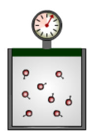Los    miles    de    millones    de    choques    que    se producen   contra   las   paredes   del   recipiente   cada segundo   dan   lugar   a   una   magnitud   macroscópica medible   de   gran   importancia:   la   presión   del   gas   (p).   Esta   presión   no   es   siempre   la   misma,   ya   que cualquier   cambio   en   las   condiciones   del   gas   que implique   a   su   vez   un   cambio   en   el   número   de choques modifica su valor. La   presión   de   un   gas   confinado   se   mide   con   un instrumento   llamado   manómetro .   En   el   Sistema Internacional,    se    expresa    en    pascales    (Pa), aunque    se    suelen    usar    más    otras    unidades específicas,   como   la   atmósfera   (atm)   y   el   milibar (mbar).     La     equivalencia     entre     todas     estas unidades es la siguiente: