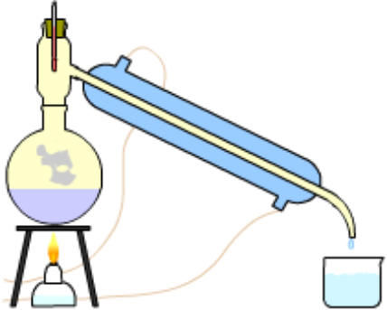 Equipo de destilación simple: mechero, matraz de destilación, termómetro y refrigerante.