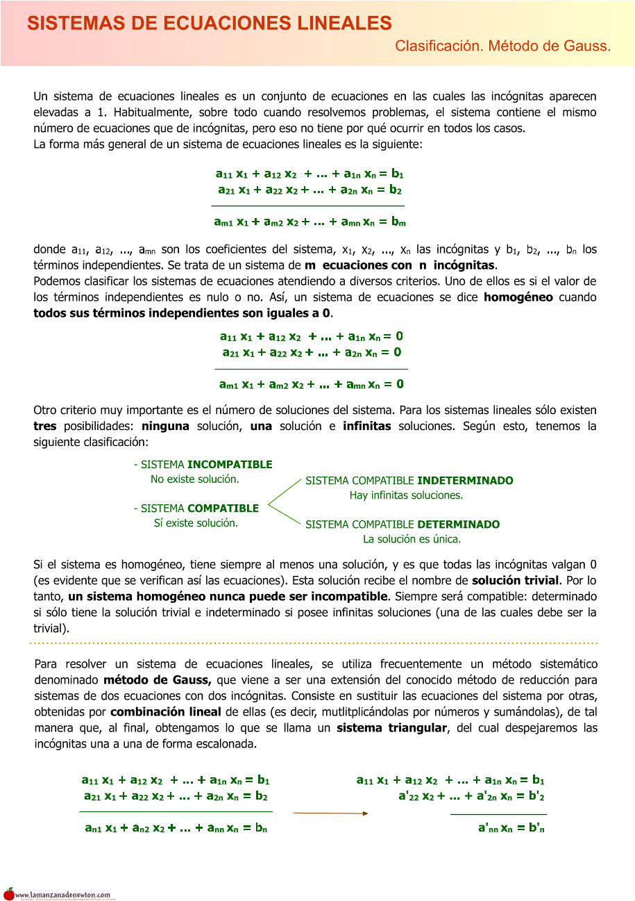 Un sistema de ecuaciones lineales es un conjunto de ecuaciones en las cuales las incógnitas aparecen elevadas a 1. Habitualmente, sobre todo cuando resolvemos problemas, el sistema contiene el mismo número de ecuaciones que de incógnitas, pero eso no tiene por qué ocurrir en todos los casos. La forma más general de un sistema de ecuaciones lineales es la siguiente: donde a11, a12, ..., amn son los coeficientes del sistema, x1, x2, ..., xn las incógnitas y b1, b2, ..., bn los términos independientes. Se trata de un sistema de m ecuaciones con n incógnitas. Podemos clasificar los sistemas de ecuaciones atendiendo a diversos criterios. Uno de ellos es si el valor de los términos independientes es nulo o no. Así, un sistema de ecuaciones se dice homogéneo cuando todos sus términos independientes son iguales a 0. Otro criterio muy importante es el número de soluciones del sistema. Para los sistemas lineales sólo existen tres posibilidades: ninguna solución, una solución e infinitas soluciones. Según esto, tenemos la siguiente clasificación: Si el sistema es homogéneo, tiene siempre al menos una solución, y es que todas las incógnitas valgan 0 (es evidente que se verifican así las ecuaciones). Esta solución recibe el nombre de solución trivial. Por lo tanto, un sistema homogéneo nunca puede ser incompatible. Siempre será compatible: determinado si sólo tiene la solución trivial e indeterminado si posee infinitas soluciones (una de las cuales debe ser la trivial). Para resolver un sistema de ecuaciones lineales, se utiliza frecuentemente un método sistemático denominado método de Gauss, que viene a ser una extensión del conocido método de reducción para sistemas de dos ecuaciones con dos incógnitas. Consiste en sustituir las ecuaciones del sistema por otras, obtenidas por combinación lineal de ellas (es decir, mutlitplicándolas por números y sumándolas), de tal manera que, al final, obtengamos lo que se llama un sistema triangular, del cual despejaremos las incógnitas una a una de forma escalonada.